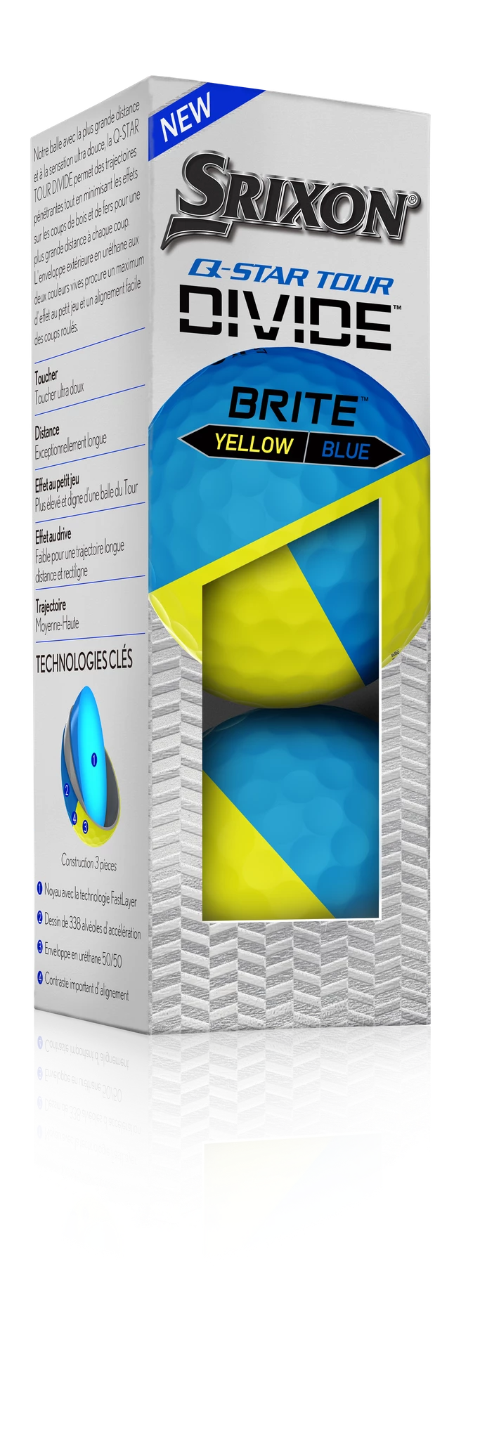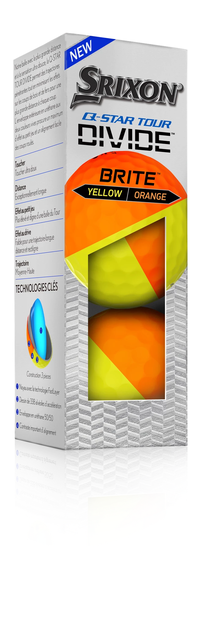 The new Q-STAR TOUR DIVIDE is a performer, through and through. Unlike painted golf balls, DIVIDE’s entire thermoplastic urethane cover is infused with bright pigments, so the color won’t scratch or tear. Plus, that premium urethane adds spin for plenty of control around the greens.